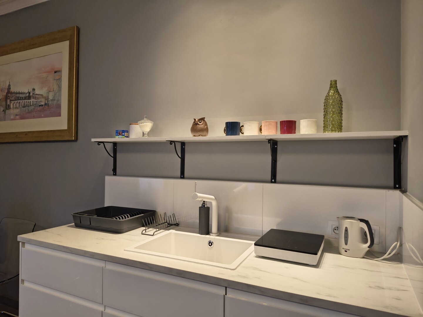 Przestronna kuchnia wspólna do dyspozycji gości — ekspres, lodówka, kuchenka mikrofalowa.